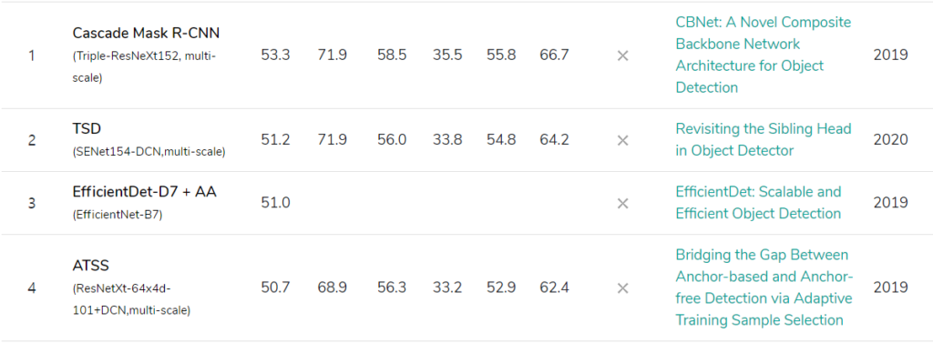 - 결론 Cascade Mask R-CNN에 제안하는 backbone(base on ResNeXt152)을 사용하여 COCO dataset SOTA를 달성하였다.