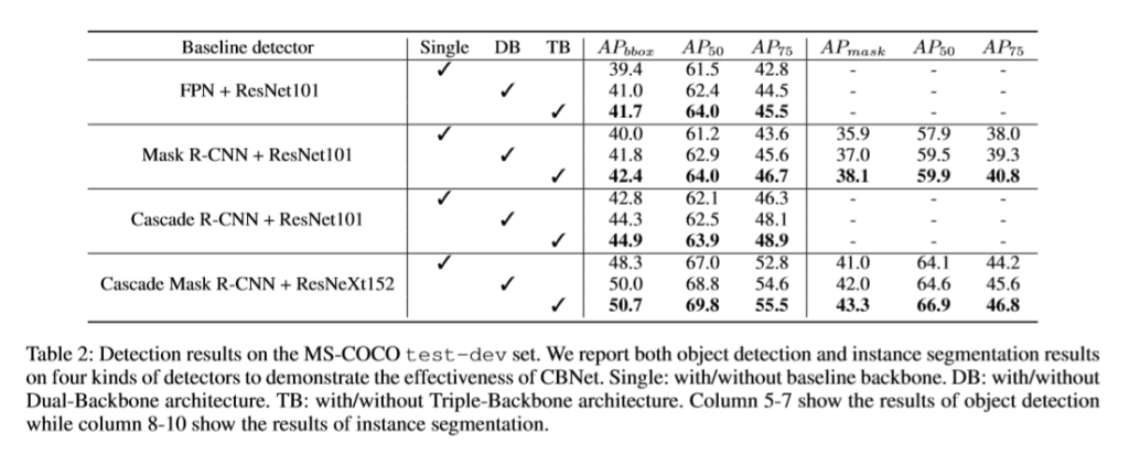 - Cascade Mask R-CNN에 제안하는 backbone을 적용함으로써, COCO dataset_test_dev(mAP of 53.3)에서 state-of-the-art를 달성하였다.