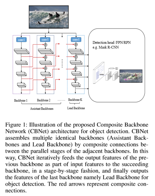 - backbone의 성능을 올리는 방법으로 인접한 동일 backbone을 composite connection하는 전략을 이용한다. -> CBNet : Composite Backbone Network