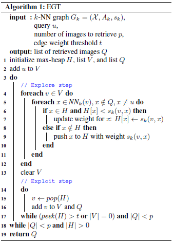 Explore-Exploit Graph Traversal for Image Retrieval방법론은 해당 pipline의 Semi-Supervised EGT부분에서 사용하게 되며 Train-V2에서 label 정보에 영향을 주는 용도로 사용 한다. 다른 팀들은 QE를 주로 사용 하였는데 해당 저자들은 QE가 매우 제한적인 역역에 대해서 기술하기 때문에 EGT를 통해서 새로운 Query그래프를 만든다고 주장했다.