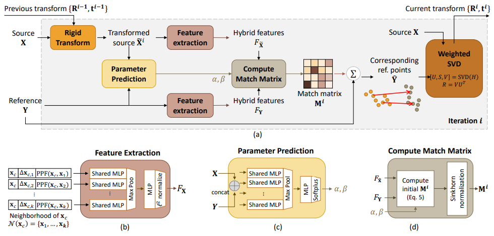 - 각 포인트의 공간 좌표와 기하학 특성들로 부터 hybrid features를 계산하는 feature extraction network를 설계하고, Sinkhorn[3] layer를 사용하여hybrid features로 부터 결과를 부드럽게 만드는 담금질을 한다.