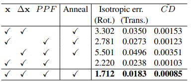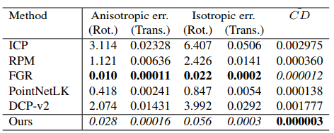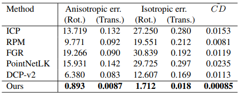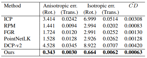 Clean data, 즉 어떤 noise도 추가 되지 않은 데이터에서는 표2에서 보듯이 비등방성과 등방성 성능은 FGR[4]이 높은 성능을 보여주지만 RPM-Net 논문에서 제시한 수식1. modified Chamfer distance의 경우 자신들의 모델이 좋다는 것을 알 수 있습니다. (기존의 Chamfer distance는 오른쪽 항의 첫번째 term만 존재하고 L1 loss를 사용합니다. )