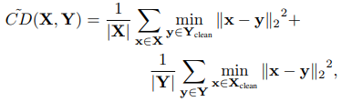 - 기존의 평가 방법인 Chamfer distance는 불공평하게 페널티를 준다고 주장하고, 수정된 수식을 사용하여 변형 소스 point cloud X와 참조 point cloud Y 사이의 불공평 문제를 줄이려고 한다.