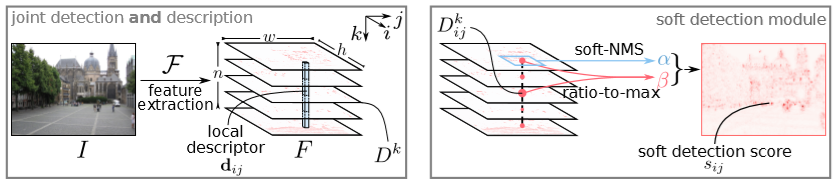 1.1에서는 한 pixel의 n개의 channel로 묶었다면 이번에는 n개의 channel을 하나씩 보게 됩니다. 3D tensor F 에서 각 channel, 즉 1차원의 h x w 의 feature map은 detection response map이라고 볼 수 있을 것이고 이는 해당 map 내 pixel마다의 score를 담고 있다고 볼 수 있을 것 입니다. 이는 SIFT에서의 DoG (Difference-of-Gaussians) 나 Harris’ corner detector에서 cornerness score map과 유사하지만, 이 논문에서는 이 response map에서 subset을 선택해 score를 후처리하게 됩니다. 제안된 detection 과정은 다음과 같이 두 부분으로 나뉩니다.