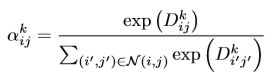 \alpha 는 다음과 같이 정의 되며 N은 (i, j)의 pixel 포함 주변 9개의 pixel의 집합으로 설정됩니다. 이 local softmax 연산은 hard feature detection에서 찾은 k인 channel에서 진행되며 다른 모든 pixel (decriptor) 에서도 이와 같은 ratio-to-max를 계산하게 됩니다.