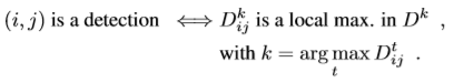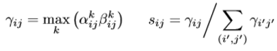 이렇게 구한 \alpha, \beta 중 pixel 마다 최대값을 선정하게되면 \gamma 라는 single score map을 얻게됩니다. 그리고 이를 normalize 하여 soft detection score s를 얻게 됩니다.
