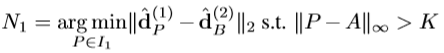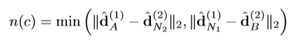 그리고 n(c)는 각 이미지의 corresponding point와 negative 사이의 distance를 늘리기 위한 negative descriptor distance 이며 위와 같습니다. Negative는 \widehat{d}^{(1)}_{A}, \widehat{d}^{(2)}_{B} 의 hardest negative를 선정하며 아래와 같고 N2도 같은 방식으로 찾게 됩니다.