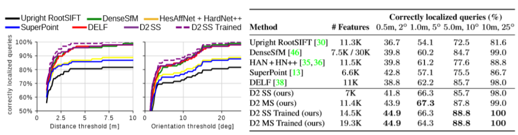 제안된 D2-Net은 Fig 4. 에서 보다시피 Aachen Day-Night dataset에서 DELF보다 높은 성능으로 state-of-the-art를 달성 했습니다. 이외에도 다른 실험을 많이 하였으니 자세한 사항은 논문을 참고해 주시기 바랍니다.
