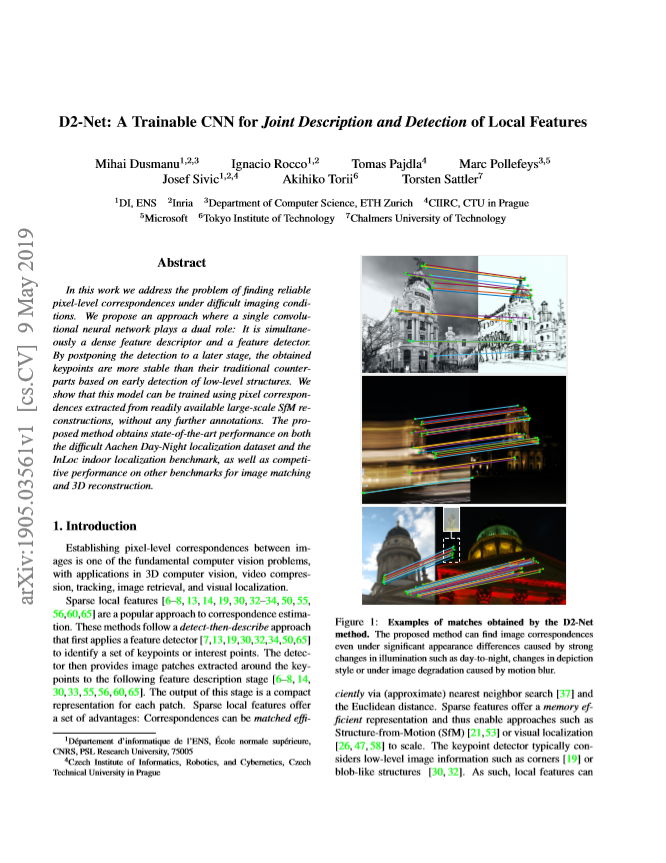 그러나 reliable 하지 못한 detector와는 반대로 descriptor는 잘 매칭 시킨다는 것을 다른 논문이 리포팅한 점을 참고로 detector stage를 dense한 descriptor stage로 대체하여 한번에 “describe” 와 “detect” 순서로 계산하는 D2-Net을 설계했습니다.