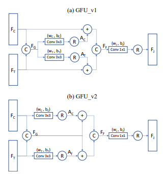 이 논문이 제시하는 fusion은 Gated Fusion Unit(GFU)이다. GFU는 color와 thermal의 피처맵을 사이즈 변화 없이 합쳐준다. GFU는 두가지 버전으로 나뉜다. GFU_v1은 color와 thermal의 concatenated feature에 convolution kernel을 적용하고, GFU_v2는 color, thermal 각각의 feature에 적용한다는 차이가 있다.