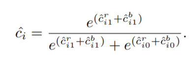 이 논문에서는 또한 labeling하는 방식에 대해서도 더 엄격하게 바꾸었는데, 첫째로는 보다 정확성을 높이기 위해, 0.7이상의 IOU값을 가진 proposal만을 보행자로, 그 외에는 배경으로 취급합니다. 둘째, BCN에서 구한 score를 앞에 RPN에서 구한 confidence score와 최소 한번 이상 합칩니다. 저자는 각각의 네트워크(RPN과 BCN)들이 융합되어야만, 각 네트워크의 특징을 잘 나타낼 수 있을 것이라 믿었습니다. 그래서 feature level 속 softmax를 하기 전에 score를 합치게 되는데, RPN의 class score와 BCN의 class score는 아래와 같은 softmax function을 통해 계산되어 집니다.