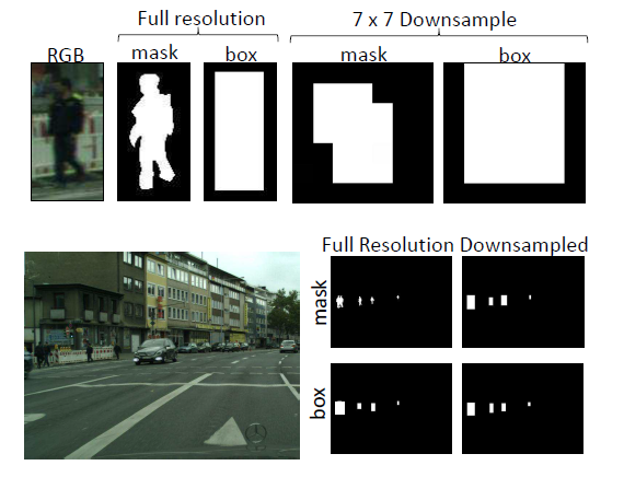 따로 구해야하는 걸까요? 그렇게 하기엔 비용적 측면에서 문제가 생깁니다. 저자가 해결한 방식은 바로 box를 down sampling하여 segmentation mask처럼 사용하자 였습니다. 그 이유는 바로 아래 그림에서 볼 수 있는데 segmentation을 다운샘플링한 모습과 box를 다운샘플링한 모습이 서로 비슷하다는 것입니다. 논문에서는 infusion layer를 conv5에 붙였기 때문에, box기반 어노테이션과 segmentation 기반 어노테이션의 차이가 크게 줄어듭니다.