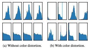 본 논문에서 제안하는 data augmentation 방법에서 color distortion의 중요성을 강조하고 있습니다. Data augmentation 방법은 두 단계로 수행하게 되는데 첫 번째 단계에서는 random cropping을 하고 원본 사이즈에 맞게 resize를 수행합니다. 그리고, 두 번째 단계에서 random color distortion과 random Gaussian blur를 수행합니다. 이렇게 두 단계로 나눈 이유에 대해 저자는 단순히 cropping을 한 것으로는 image의 histogram 분포가 그림2. 의 왼쪽과 같이 같은 경향성을 가지고 있어 다양성을 학습하기 어렵지만 color distortion을 적용한 경우 그림2. 의 오른쪽과 같이 다양한 분포를 보여주므로 성능을 향상시키는데 도움이 된다고 말합니다.