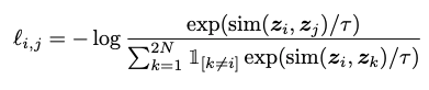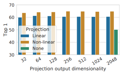 Data augmentation 단계를 수행한 후에 이미지의 특징을 추출할 때는 기존 supervised learning에서 학습한 pre-trained 모델을 가져와서 사용합니다. 이 논문에서는 ResNet-50[2]을 사용하며 추출한 특징을 가지고, 2개 층의 MLP를 학습하기 위해 NT-Xent라는 loss(수식1.)를 제안하고 있습니다. 그림 3. 은 각 MLP 사이에 non-linear한 ReLU를 사용하는 것이 더 성능이 좋은 ablation 연구를 보여주고 있습니다. 뒤에서 자세하게 설명하겠지만 batch 중에서 1개의 정답 이외의 다른 image들은 contrastive 하기 때문에 negative 예제이므로 아래와 같이 similar function(본 논문에서는 cosine distance)을 사용하여 loss를 계산하게 됩니다.
