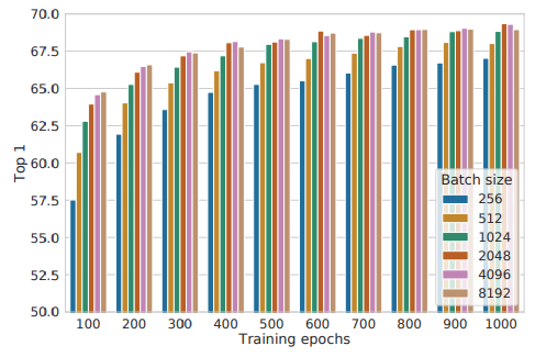 본 연구가 Google Research에서 진행되었기 때문에 역시 TPU를 사용한 결과를 보여주고 있는데요. 주목할 점은 supervised learning 학습은 step이 늘어날 수록 최고 성능에서 점점 낮아지는 것을 볼 수 있는데 그림 4. 와 같이 self-supervised learning은 학습 step이 늘어날 수록 그리고 batch가 늘어날 수록 성능이 점점 더 좋아지는 것을 보여주고 있습니다.