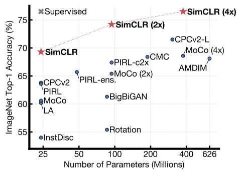 이번 논문 포스트는 Google Research에서 발표한 SimCLR (Simple framework for Contrastive Learning of visual Representations)입니다. 논문에서 언급한 핵심 방법과 성과는 (1) 심플한 data augmentation 방법을 조합하여 효율적인 예측을 하였고, (2) non-linear layer 2개를 추가하여 contrastive loss를 통해 성능을 올린 점, 마지막으로 (3) self-supervised learning에서는 batch의 크기와 훈련 step을 늘릴 경우 성능이 점점 향상된다는 것입니다.