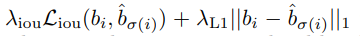 그리고 여기서 박스에 대한 cost를 계산하기 위해서 논문의 방법은 L1 loss와 generalize IoU loss를 결합해서 사용하고, 이를통해 scale-invariant 만들 수 있다. 다시 정리해서 수식화하면 다음과 같다.