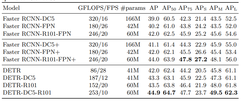 이번에 페이스북AI에서 제안하는 DE:TR 모델은 기존 Object Detection의 프레임과는 완전히 다르다. DE:TR은 NLP에서 사용되는 Encoder-Decoder transformer 를 Object Detection으로 가져왔고, COCO 데이터셋에 대해서 평가한 결과 기존 Faster-RCNN 기반 네트워크들과 비슷한 성능을 나타냈다. 또한 DE:TR은 large object에 대해서는 확실한 성능 개선이 나타났다.