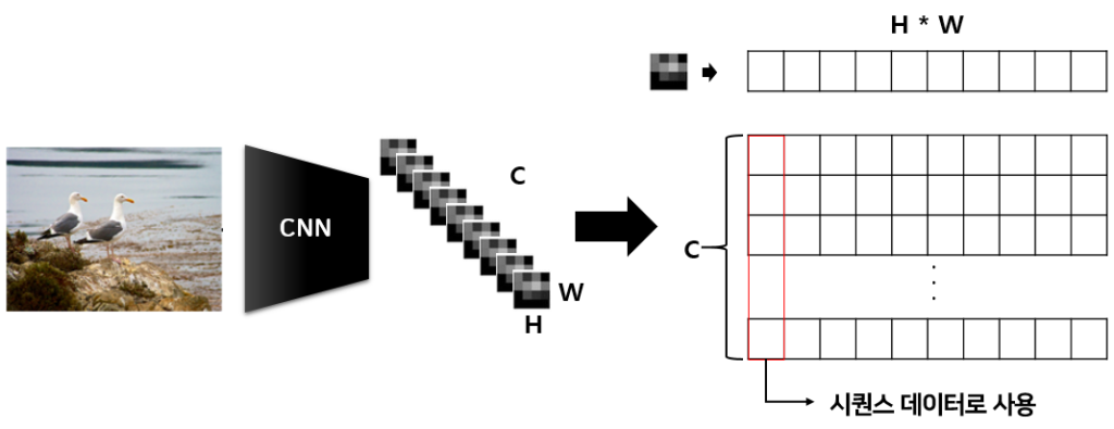 위의 구조는 DE:TR:의 구조이다. 가장먼저 백본(Resnet50,101) 이미지에 대한 피처를 추출한다. 그리고 이 추출한 피처를 가지고 positional encoding과 함께 NLP에서 사용하는 transformer encoder 입력으로 들어가게 되는데, 이때 이미지는 시퀀스 데이터가 아니다. 이를 시퀀스 데이터와 같이 표현하기 위해서 다음과 같은 작업을 거친다.
