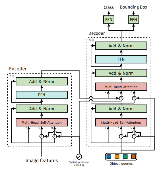 자 그럼 이렇게 만든 encoding vector를 가지고 Transformer decoder에서는 또다른 시퀀스 데이터를 만들게 되는데, 기억해야할 것은 Transformer decoder 은 입력가 동일한 시퀀스 데이터를 생산하며 이 과정에서 인코딩 벡터를 사용하는것이다. 위의 그림에서는 4개의 object queries(시퀀스 데이터)가 입력으로 들어가 4개의 out put이 나오는 것을 확인할 수 있다. 입력과 동일한 out put이 나오며 이는 최종적으로 object detection에서 모델이 찾을 수 있는 최대 object의 수와 동일하다. 그러므로 적절한 object queries를 설정해주는 것이 중요하다. 또 한가지 특징은 여기서 object queries는 특별한 값이 아닌 랜덤 벡터라는 점이다. Transformer decoder 구조를 입력하는 것이기 때문에 내가 원하는 output의 값을 입력으로 넣으면 결국 최종적으로는 class와 box의 정보를 얻을 수 있는 데이터를 인코딩 벡터의 값들을 통해서 만들어낼 수 있다.
