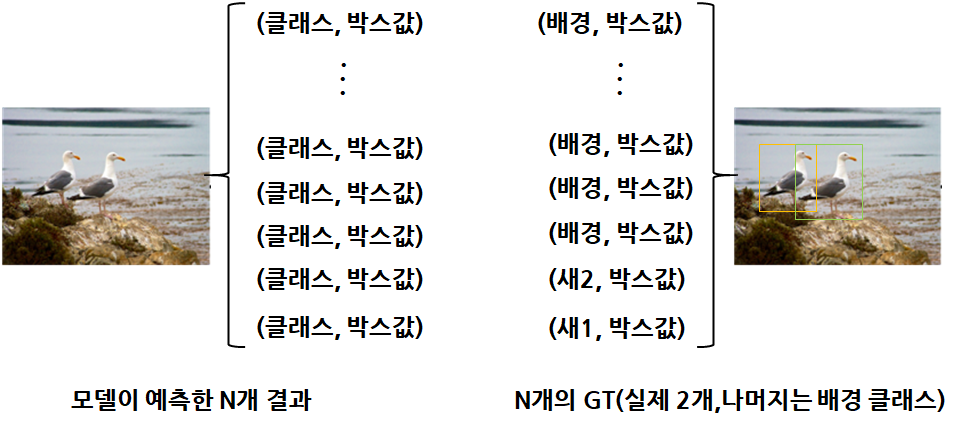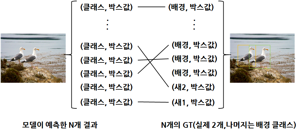 앞서 구조 설명할때 transformer encoder는 내가 설정한 Object queries와 동일한 숫자의 시퀀스 데이터를 만든다고 설명했다. 즉 내가 하나의 이미지당 N개의 Object를 예측하겠다고 설정하면 실제 이미지의 Object가 N개 이상이여도 N개만 예측하고 N보다 작아도 심지어 1개라도 N개의 결과를 만들어 낸다. 모델은 항상 N개의 예측을 수행하게 되고, 실제 GT는 영상속 사람이 어노테이션한 GT와 클래스 정보 그리고 만약 N개보다 작다면 나머지는 배경클래스에대한 정보로 설정해 N개를 맞춘다.