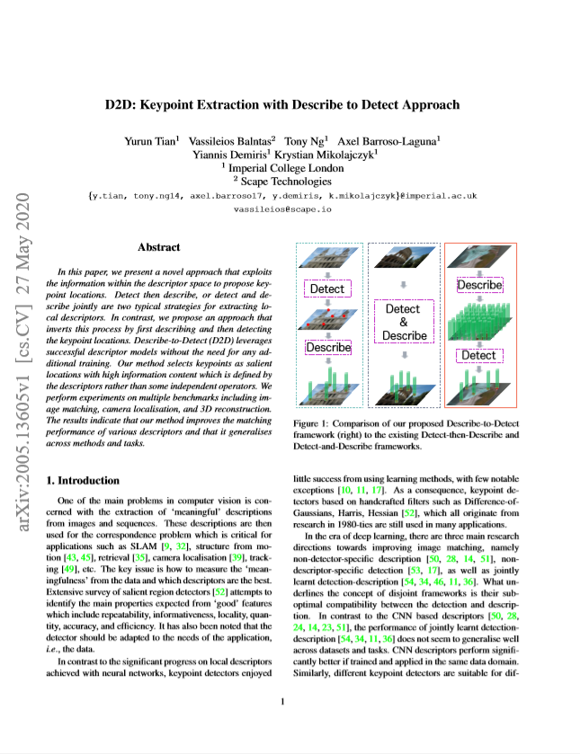 이전부터 Computer vision에서 영상의 keypoint 를 추출하는 것은 자주 풀어오던 문제였습니다. 주로 handcraft 알고리즘이라고 불리우는 전통적인 알고리즘들은 keypoint 의 위치를 detect 한 뒤, 특징을 표현하는 describe 과정을 거쳤습니다. 그러나 최근 describe-detect 순서로 keypoint를 추출하는 딥러닝 기반 방법론들이 나타나게 되었습니다. 우선적으로 CNN backbone network를 통해 전체 영상을 describe 하고, describe 된 feature map으로 detect 를 하는 방식으로 이루어지게 됩니다. 이번에 소개할 D2D도 이와 같으며 contribution을 요약하자면 다음과 같습니다.