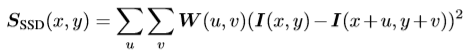 가정 2를 확인하기 위해 현재 값고 주변 값 사이의 관계를 측정할 때는 autocorrelation 을 사용합니다. Handcraft 알고리즘인 Moravec corner detector와 Harris detector 에서도 이를 사용했었습니다. 이러한 autocorrelation 을 sum of squared differences (SSD) 로 식 (2)와 같이 구현되게 됩니다. I(x, y) 는 pixel intensity 이며 (u, v) 는 (x, y) 중심의 window index를 의미합니다. 만약 S_{SSD}(x, y) 의 값이 크다면 주변과 낮은 유사도를 지니는 것을 의미합니다. 저자는 SSD 에서 pixel intensity 부분을 dense 한 descriptor 로 대체 하였으며 다음과 같이 변경하였습니다.