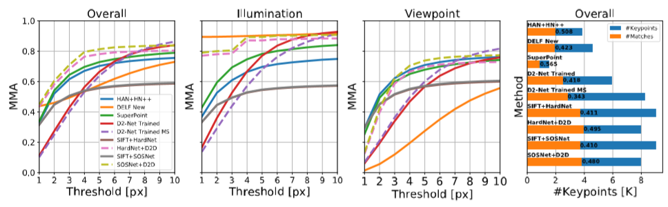 제안된 방법을 기존 존재하는 local descriptor 를 추출해 내는 방법론에 적용했을 때 특히 중요하다고 말할 수 있는 5px 미만의 threshold 구간에서 다른 방법론들 보다 높은 성능을 나타내었습니다.