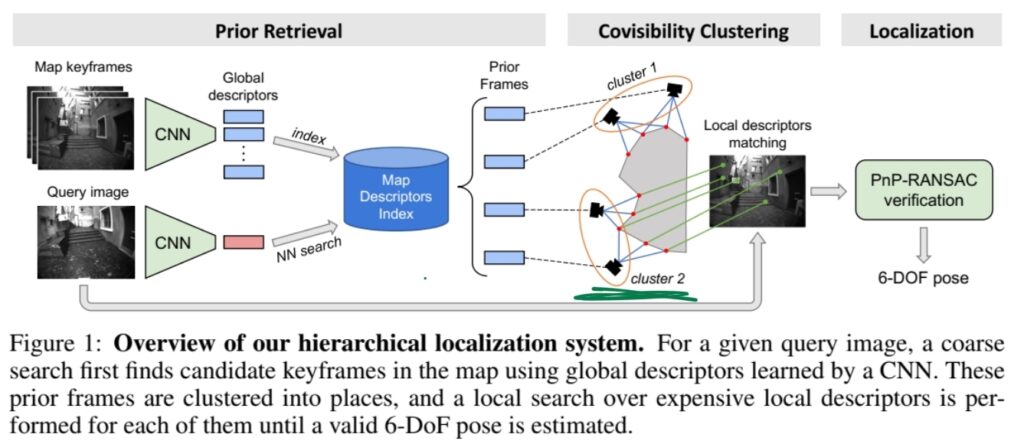 전체적인 pipeline은 1. Map의 keyframes을 global descriptor로 추출한 index와 query로부터 추출된 global descriptor를 얻습니다. 2. query를 index로부터 Nearest neighbor searsh를 진행하여 prior frame(top k)을 구합니다. 3. prior frame을 bipartite graph를 통해 가시적으로 유사한 공간을 보는 영상끼리 클러스터링을 진행합니다. 4. 방법 3으로부터 얻은 clue에 local matching과 PnP를 수행하여 6-DOF를 얻습니다. 설명드린 내용은 Figure 1.를 통해 도식화된 pipeline을 확인 할 수 있습니다.
