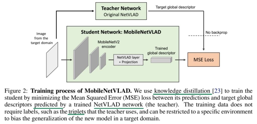 - 학습의 효율과 성능 향상을 위해서 pre-trained NetVLAD를 knowledge distillation을 사용하여 MobileNetVLAD를 학습했습니다. (Figure 2)