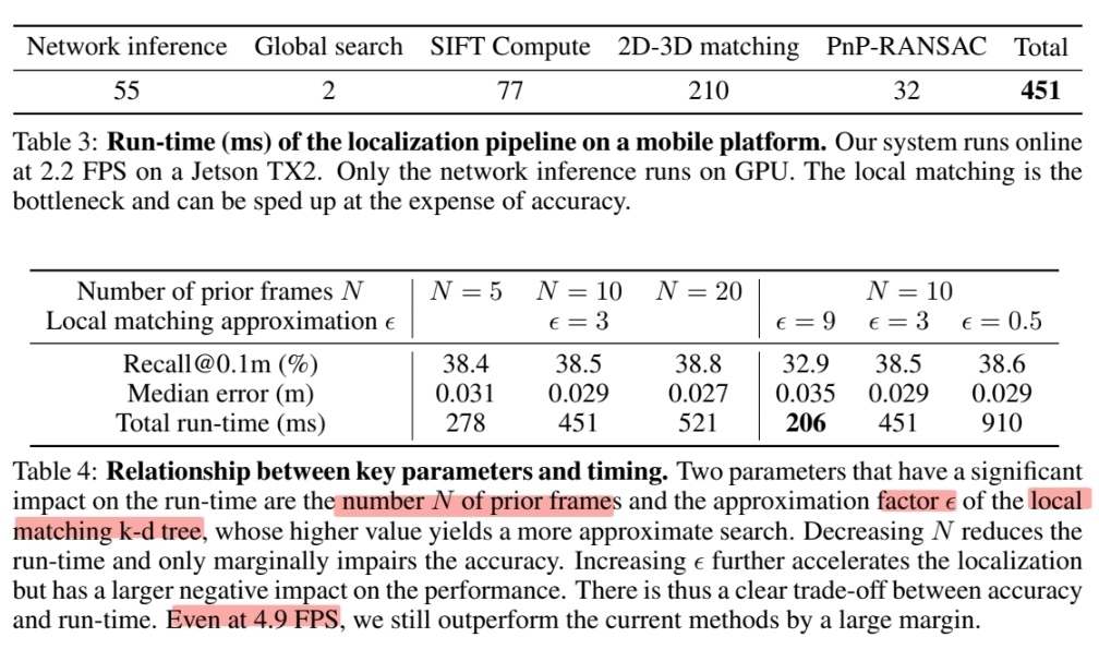 또한 original Netvald의 연산량을 줄이기위해 original Netvald로부터 knowledge distillation을 한 mobileNetvald를 이용했으며, 2D-3D matching에서 속도와 성을 향상시키기 위해 camera pose가 aliasing되도록 clustering하여 3D 포인트를 줄이는 방법을 이용했습니다.