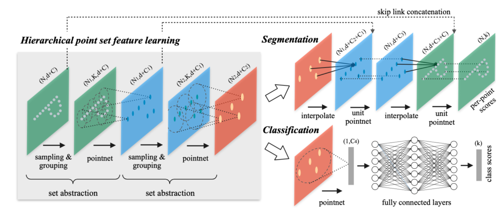 이전 PointNet 리뷰에서 ” point clouds data의 (x, y, z)를 사용하여 k개의 class를 구분할 수 있고, n x m개의 score output으로 subcategory를 결정할 수 있습니다. (n은 point clouds data의 개수, m은 subcategory의 개수입니다.)”라고 이야기하셨는데 해당 논문도 ‘++’이기 때문에 같을것이라고 생각합니다.