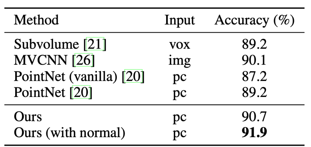 표 1. ModelNet40 데이터의 shape classification 정확도