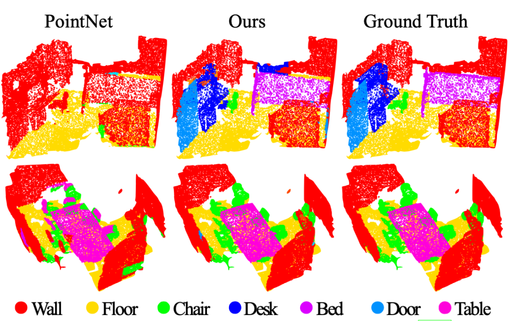 그림 5의 정성적 결과 비교로 PointNet++가 이전 연구에 비해 scene에서 object, 즉 전체에서 부분을 잘 구분해내는지 알 수 있습니다.