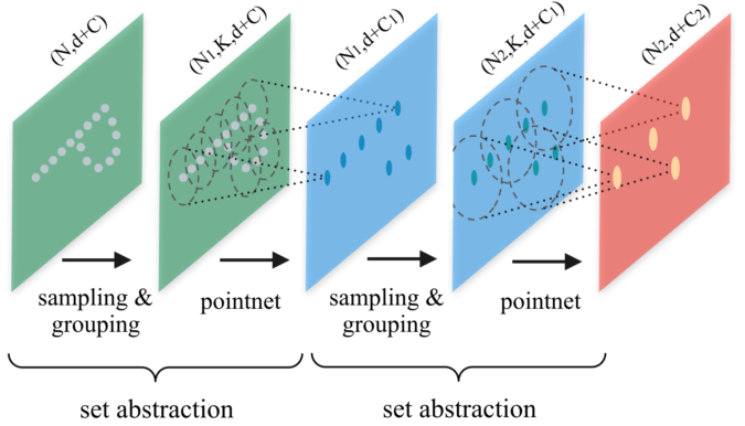그림 1은 PointNet++의 구조이며 다시 한번 핵심 흐름을 말하자면: