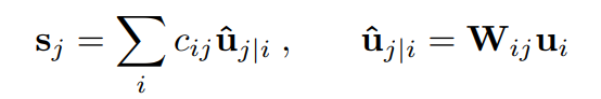 캡슐의 첫번째 레이어를 제외한 모든 레이어에 대하여, 캡슐의 전체 입력 s_{j} 는 예측된 벡터 \hat{u}_{j|i} 전체에 대하여 가중치를 곱한 것입니다. 그리고 이 때 \hat{u}_{j|i} 는 단순히 가중치 행렬에 캡슐 u_{ij} 를 곱한 것 입니다.