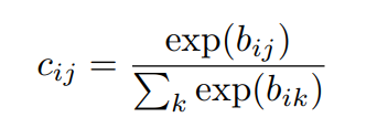 그럼 이제 이 b_{ik} 는 캡슐 j의 현재 출력 벡터 v_{j} 와 캡슐 i로 만들어진 전체 예측 벡터 \hat{u} _{j|i} 의 agreement를 계산한 후( \hat{u} _{j|i} ·v_{j} ) 이를 업데이트하여 구할 수 있습니다.