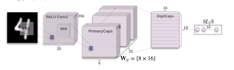 마지막 레이어(DigitCaps)는 하나의 digit당 16D 캡슐을 가지고 각각의 캡슐들은 레이어에 존재하는 모든 캡슐로부터 입력값을 받습니다.