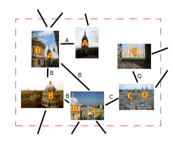 이 논문 이전 Turcot 과 Lowe라는 연구자들은 retrieval 의 성능을 올리기 위해 Fig 3. 과 같이 그래프에 있는 모든 인접 이미지의 visual word 수로 augmentation 하였습니다. 이는 query expansion 에서의 문제들을 데이터 베이스 측면에서 상호보완해준 방식입니다. 그러나 이 방식은 인접 이미지의 모든 visual word 로 augmentation을 하기에 시각적으로 보이지 않는 visual word 에 대해서도 augmentation 되어 연관성이 없는 인접 이미지도 포함될 수 있습니다. 저자는 이 방식에서 눈에 보이는 visual word 만을 이용하고, query 와 인접 이미지에서 동일한 visual word 에 대해 homography 를 추정할 수 있을 때만 image graph를 만들어 인접 이미지를 구하는 방식인 SPAUG(Spatial database-side feature augmentation) 을 제안했습니다.