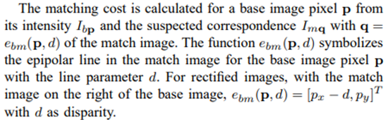Ib,Im 이미지에 대한 정의는 아래와 같고,p는 base image의 pixel값 q는 epipolar line에서 매치되는 대응점이다.(자세한 수식은 아래 참조)