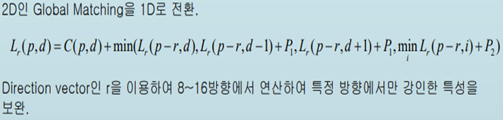 SGM은 지역 기반 매칭 방법을 이용하여 지원점을 추출하기 위한 초기 매칭 비 용(Initial Cost)을 구하고, 각각의 방향에 대한 경로 비용(Path Cost)을 누적하는 방식을 이용하여 고밀도 디스패리티 맵을 생성한다.