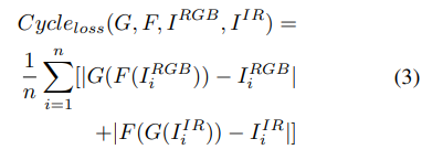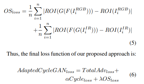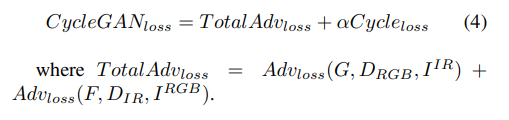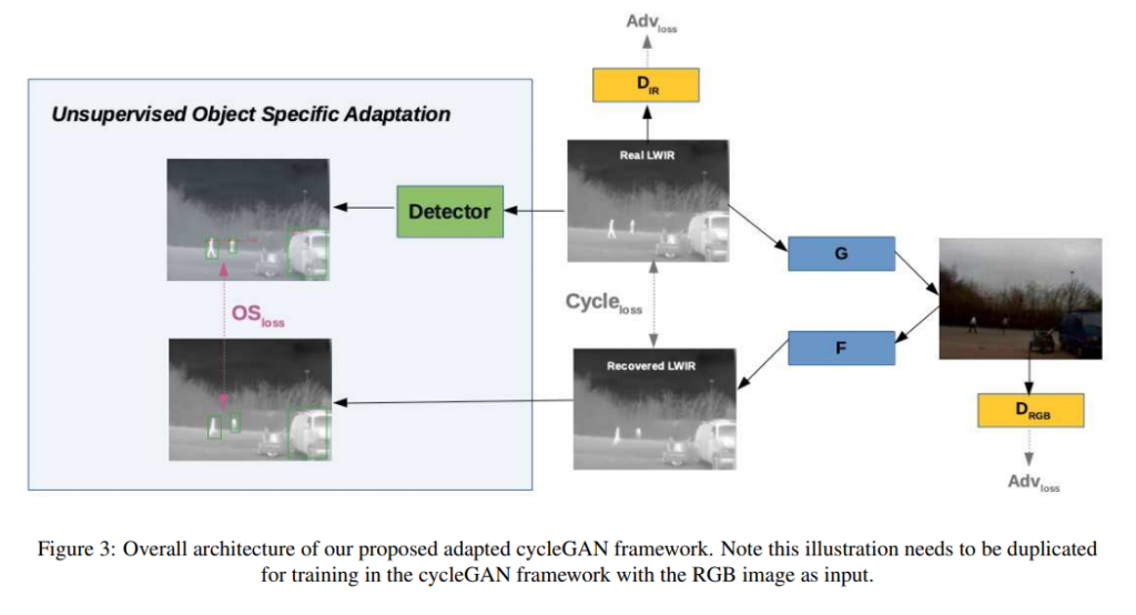 - Cycle-GAN network를 이용한 unsupervised adaptation을 제안하고 있다. 또한 새로운 loss를 설계하여 real and recovered RGB/LWIR 이미지 속 object ROI의 appearance 차이를 최소화 한다.