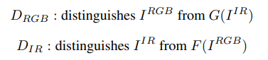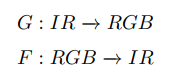 우선 논문에서 베이스로한 CycleGANnetwork에 대한 설명이다. 해당 프레임워크를 설명하고 있는 그림을 이해하기 위해서 몇가지 논문에서 정의한 명명법에 대해서 알아보자. 먼저 G는 Thermal 이미지로 RGB이미지를 생성하는 생성자, F는 RGB이미지로 Thermal 이미지를 생성하는 생성자로 명명한다.