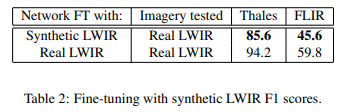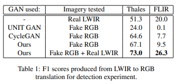 두번째로는 Thermal 이미지에서도 detection이 가능하도록 RGB로 학습한 detection network를 fine-tune하기위해 RGB를 Thermal로 변환해 학습하였고, 이 방법도 85.6%의 F1 socre를 달성했다고 논문은 설명한다.