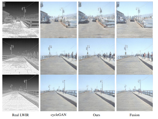 - Non corresponding datasets으로도 Thermal 이미지를 RGB 이미지로 변환이 가능함을 보였으며, 이를 통해서 생성한 synthetic RGB 이미지가 RGB로 학습된 detection 모델에서도 사용할 수 있다. 게다가 이 논문은 synthetic RGB와 real LWIR을 합성해 F1 socre를 향상시킨 첫 논문이다.
