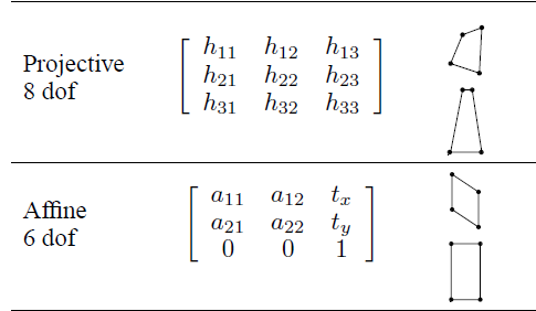 위에 그림을 보시면, Affine 변환은 직사각형, 평행사변형 등과 같이, 변환후에도 항상 직선의 평행성이 보존되는 결과값을 제공합니다. 반면에 투영변환은 사다리꼴과 같이 직선의 평행성이 보존이 되지가 않습니다.