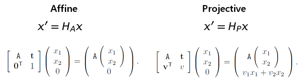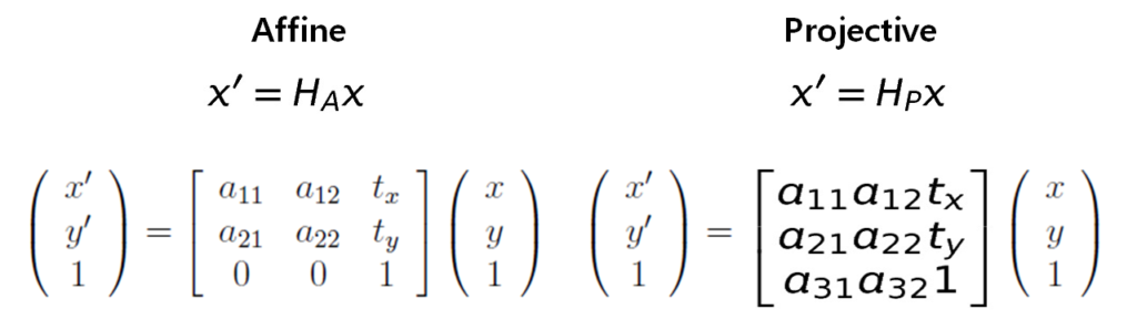 위에 그림을 보면, 좌측에 Affine 변환과 우측에 투영변환은 생김새가 매우 유사합니다. 먼저 공통점으로, 회전변환 특성을 지니고 있는 a11~a22 요소들과, translation 특성을 지니고 있는 tx, ty요소를 지니고 있습니다.