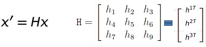 이제 위 좌측에 수식처럼 어떠한 점 x에 대하여 호모그래피 변환행렬 H를 적용시켜 새로운 점 x’을 만든다고 해봅시다.