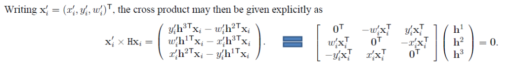 그럼 이제 변환 후의 점 벡터 x’과 Hx를 외적하게 되면 다음과 같이 연산이 진행되어 결과값은 0이 되게 됩니다.