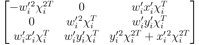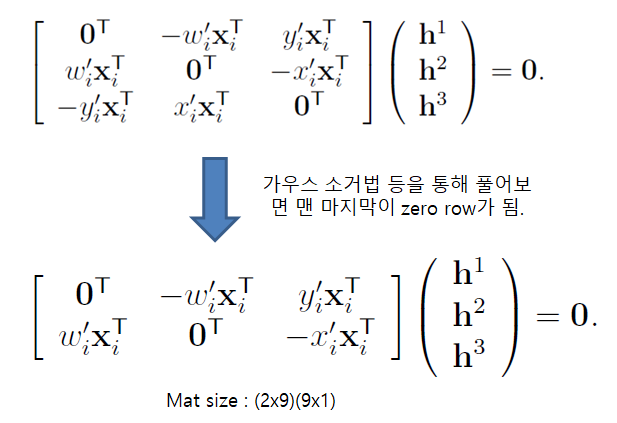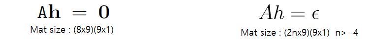 여기서 유의하셔야할 점은, 우측에 행렬이 얼핏보면 3×3 행렬과 3×1 행렬의 곱으로 보이실 수 있겠지만, 좌측 행렬의 x^T는 점을 나타내는 벡터이며, h는 H행렬의 column이므로, 해당 연산은 3×9 행렬과 9×1행렬의 곱임을 아셔야합니다.